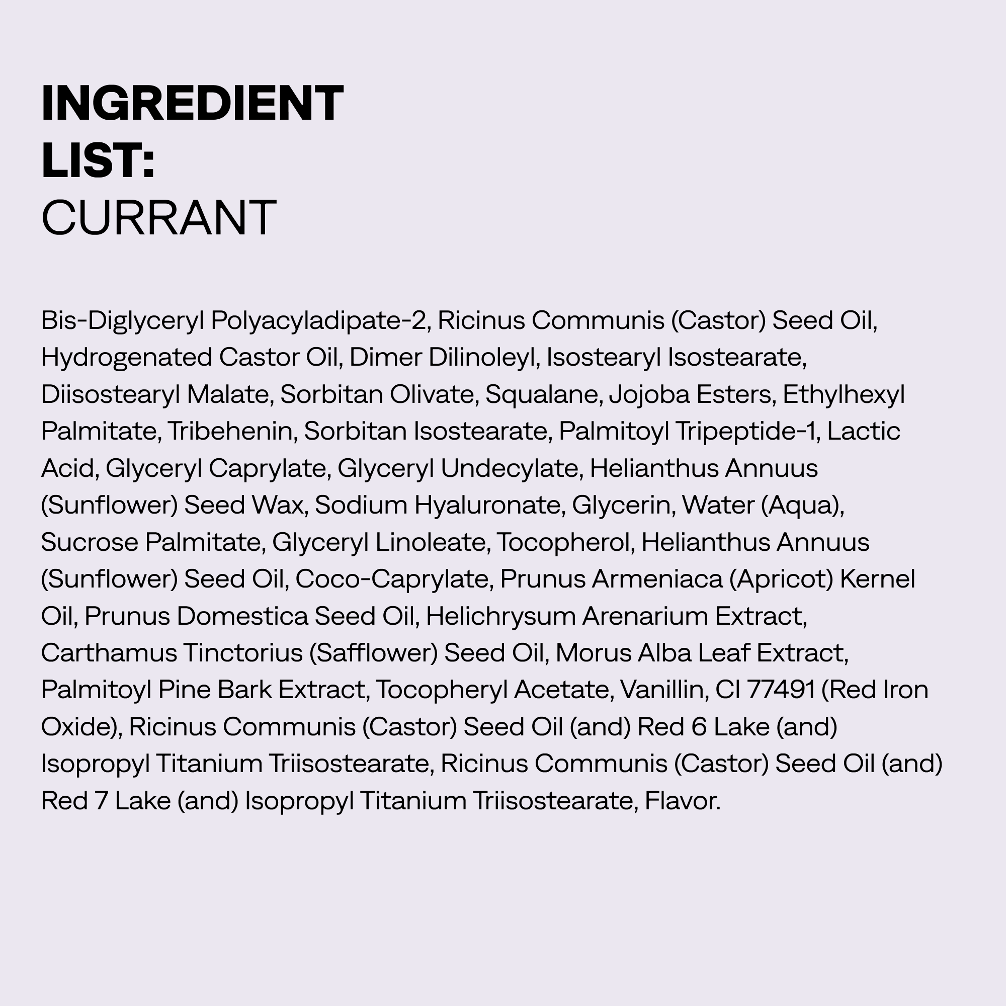 CURRANT INGREDIENTS/INGREDIÈNTS:Bis-Diglyceryl Polyacyladipate-2, Ricinus Communis (Castor) Seed Oil, Hydrogenated Castor Oil, Dimer Dilinoleyl, Isostearyl Isostearate, Diisostearyl Malate, Sorbitan Olivate, Squalane, Jojoba Esters, Ethylhexyl Palmitate, Tribehenin, Sorbitan Isostearate, Palmitoyl Tripeptide-1, Lactic Acid, Glyceryl Caprylate, Glyceryl Undecylate, Helianthus Annuus (Sunflower) Seed Wax, Sodium Hyaluronate, Glycerin, Water (Aqua), Sucrose Palmitate, Glyceryl Linoleate, Tocopherol, Helianthus Annuus (Sunflower) Seed Oil, Coco-Caprylate, Prunus Armeniaca (Apricot) Kernel Oil, Prunus Domestica Seed Oil, Helichrysum Arenarium Extract, Carthamus Tinctorius (Safflower) Seed Oil, Morus Alba Leaf Extract, Palmitoyl Pine Bark Extract, Tocopheryl Acetate, Vanillin, CI 77491 (Red Iron Oxide), Ricinus Communis (Castor) Seed Oil (and) Red 6 Lake (and) Isopropyl Titanium Triisostearate, Ricinus Communis (Castor) Seed Oil (and) Red 7 Lake (and) Isopropyl Titanium Triisostearate, Flavor.