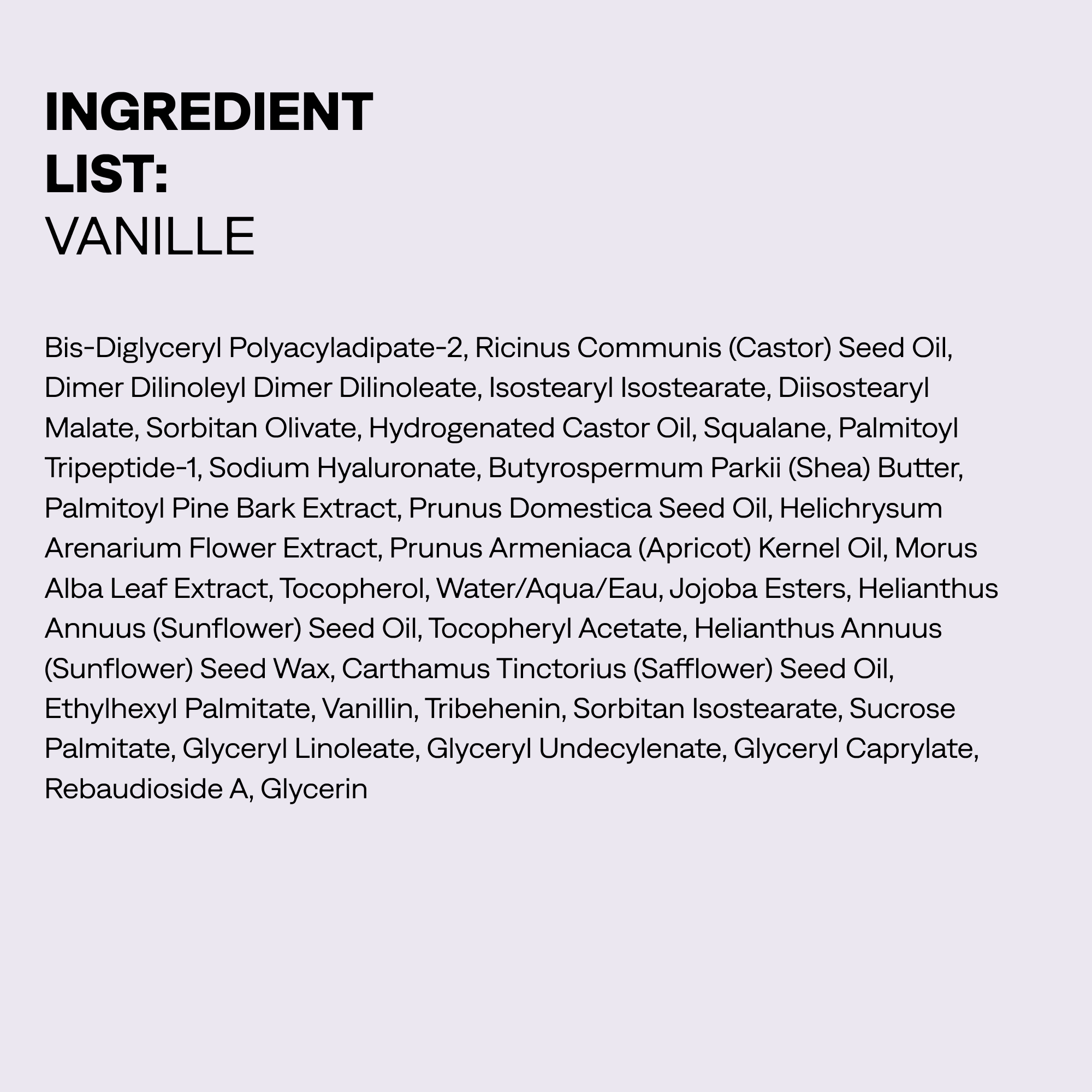 VANILLE INGREDIENTS/INGRÉDIENTS: Bis-Diglyceryl Polyacyladipate-2, Ricinus Communis (Castor) Seed Oil, Dimer Dilinoleyl Dimer Dilinoleate, Isostearyl Isostearate, Diisostearyl Malate, Sorbitan Olivate, Hydrogenated Castor Oil, Squalane, Palmitoyl Tripeptide-1, Sodium Hyaluronate, Butyrospermum Parkii (Shea) Butter, Palmitoyl Pine Bark Extract, Prunus Domestica Seed Oil, Helichrysum Arenarium Flower Extract, Prunus Armeniaca (Apricot) Kernel Oil, Morus Alba Leaf Extract, Tocopherol, Water/Aqua/Eau, Jojoba Esters, Helianthus Annuus (Sunflower) Seed Oil, Tocopheryl Acetate, Helianthus Annuus (Sunflower) Seed Wax, Carthamus Tinctorius (Safflower) Seed Oil, Ethylhexyl Palmitate, Vanillin, Tribehenin, Sorbitan Isostearate, Sucrose Palmitate, Glyceryl Linoleate, Glyceryl Undecylenate, Glyceryl Caprylate, Rebaudioside A, Glycerin