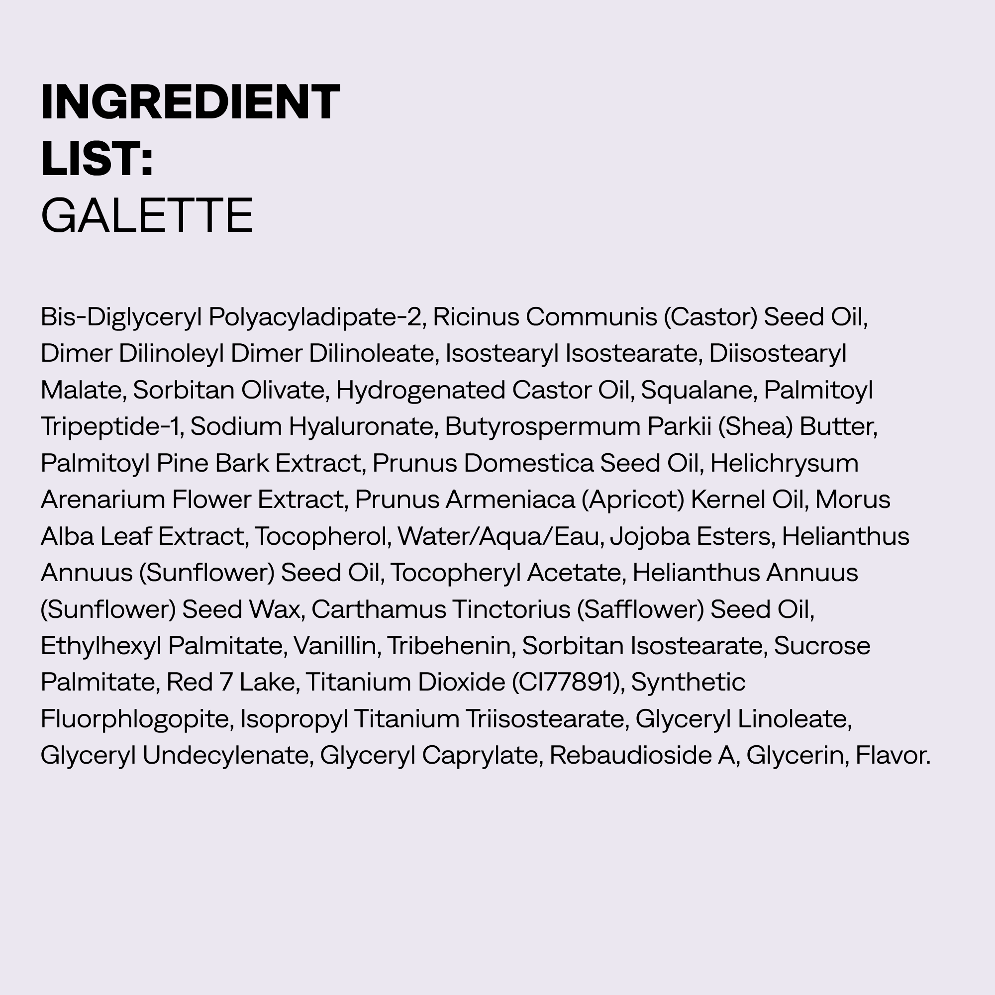 GALETTE INGREDIENTS/INGRÉDIENTS: Bis-Diglyceryl Polyacyladipate-2, Ricinus Communis (Castor) Seed Oil, Dimer Dilinoleyl Dimer Dilinoleate, Isostearyl Isostearate, Diisostearyl Malate, Sorbitan Olivate, Hydrogenated Castor Oil, Squalane, Palmitoyl Tripeptide-1, Sodium Hyaluronate, Butyrospermum Parkii (Shea) Butter, Palmitoyl Pine Bark Extract, Prunus Domestica Seed Oil, Helichrysum Arenarium Flower Extract, Prunus Armeniaca (Apricot) Kernel Oil, Morus Alba Leaf Extract, Tocopherol, Water/Aqua/Eau, Jojoba Esters, Helianthus Annuus (Sunflower) Seed Oil, Tocopheryl Acetate, Helianthus Annuus (Sunflower) Seed Wax, Carthamus Tinctorius (Safflower) Seed Oil, Ethylhexyl Palmitate, Vanillin, Tribehenin, Sorbitan Isostearate, Sucrose Palmitate, Red 7 Lake, Titanium Dioxide (CI77891), Synthetic Fluorphlogopite, Isopropyl Titanium Triisostearate, Glyceryl Linoleate, Glyceryl Undecylenate, Glyceryl Caprylate, Rebaudioside A, Glycerin, Flavor.