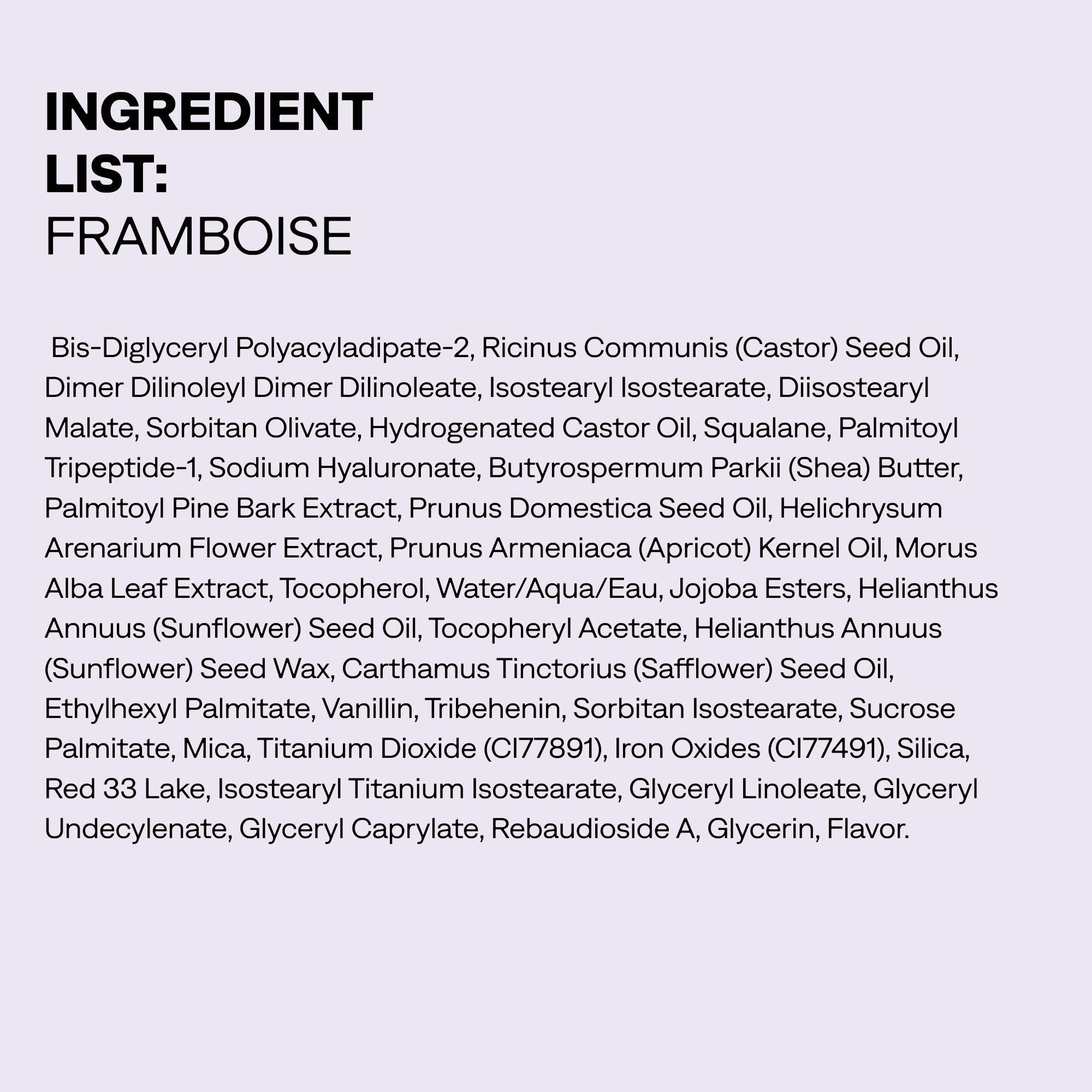 FRAMBOISE INGREDIENTS/INGREDIÈNTS: Bis-Diglyceryl Polyacyladipate-2, Ricinus Communis (Castor) Seed Oil, Dimer Dilinoleyl Dimer Dilinoleate, Isostearyl Isostearate, Diisostearyl Malate, Sorbitan Olivate, Hydrogenated Castor Oil, Squalane, Palmitoyl Tripeptide-1, Sodium Hyaluronate, Butyrospermum Parkii (Shea) Butter, Palmitoyl Pine Bark Extract, Prunus Domestica Seed Oil, Helichrysum Arenarium Flower Extract, Prunus Armeniaca (Apricot) Kernel Oil, Morus Alba Leaf Extract, Tocopherol, Water/Aqua/Eau, Jojoba Esters, Helianthus Annuus (Sunflower) Seed Oil, Tocopheryl Acetate, Helianthus Annuus (Sunflower) Seed Wax, Carthamus Tinctorius (Safflower) Seed Oil, Ethylhexyl Palmitate, Vanillin, Tribehenin, Sorbitan Isostearate, Sucrose Palmitate, Mica, Titanium Dioxide (CI77891), Iron Oxides (CI77491), Silica, Red 33 Lake, Isostearyl Titanium Isostearate, Glyceryl Linoleate, Glyceryl Undecylenate, Glyceryl Caprylate, Rebaudioside A, Glycerin, Flavor.