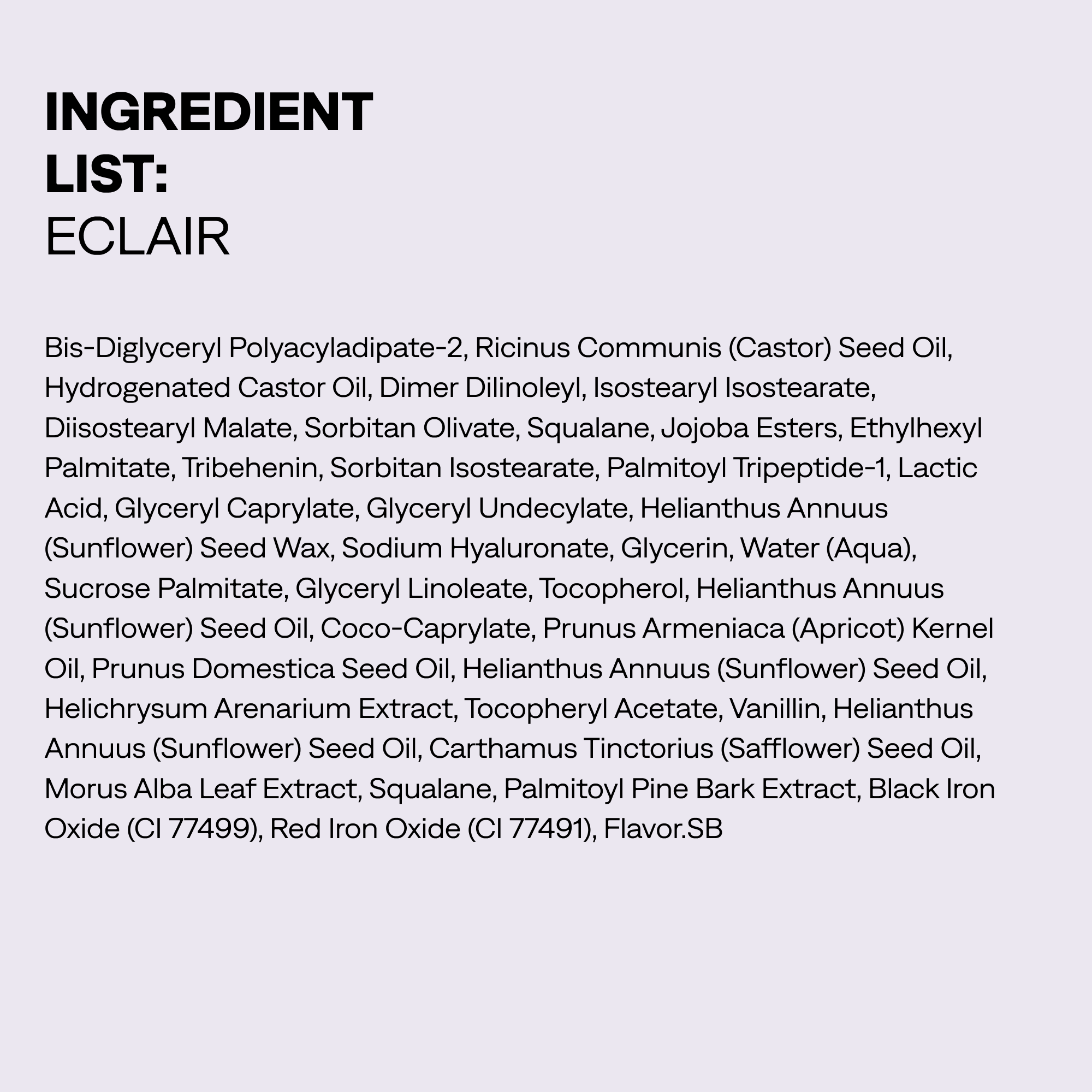 ECLAIR INGREDIENTS/INGREDIÈNTS: Bis-Diglyceryl Polyacyladipate-2, Ricinus Communis (Castor) Seed Oil, Hydrogenated Castor Oil, Dimer Dilinoleyl, Isostearyl Isostearate, Diisostearyl Malate, Sorbitan Olivate, Squalane, Jojoba Esters, Ethylhexyl Palmitate, Tribehenin, Sorbitan Isostearate, Palmitoyl Tripeptide-1, Lactic Acid, Glyceryl Caprylate, Glyceryl Undecylate, Helianthus Annuus (Sunflower) Seed Wax, Sodium Hyaluronate, Glycerin, Water (Aqua), Sucrose Palmitate, Glyceryl Linoleate, Tocopherol, Helianthus Annuus (Sunflower) Seed Oil, Coco-Caprylate, Prunus Armeniaca (Apricot) Kernel Oil, Prunus Domestica Seed Oil, Helianthus Annuus (Sunflower) Seed Oil, Helichrysum Arenarium Extract, Tocopheryl Acetate, Vanillin, Helianthus Annuus (Sunflower) Seed Oil, Carthamus Tinctorius (Safflower) Seed Oil, Morus Alba Leaf Extract, Squalane, Palmitoyl Pine Bark Extract, Black Iron Oxide (CI 77499), Red Iron Oxide (CI 77491), Flavor.SB