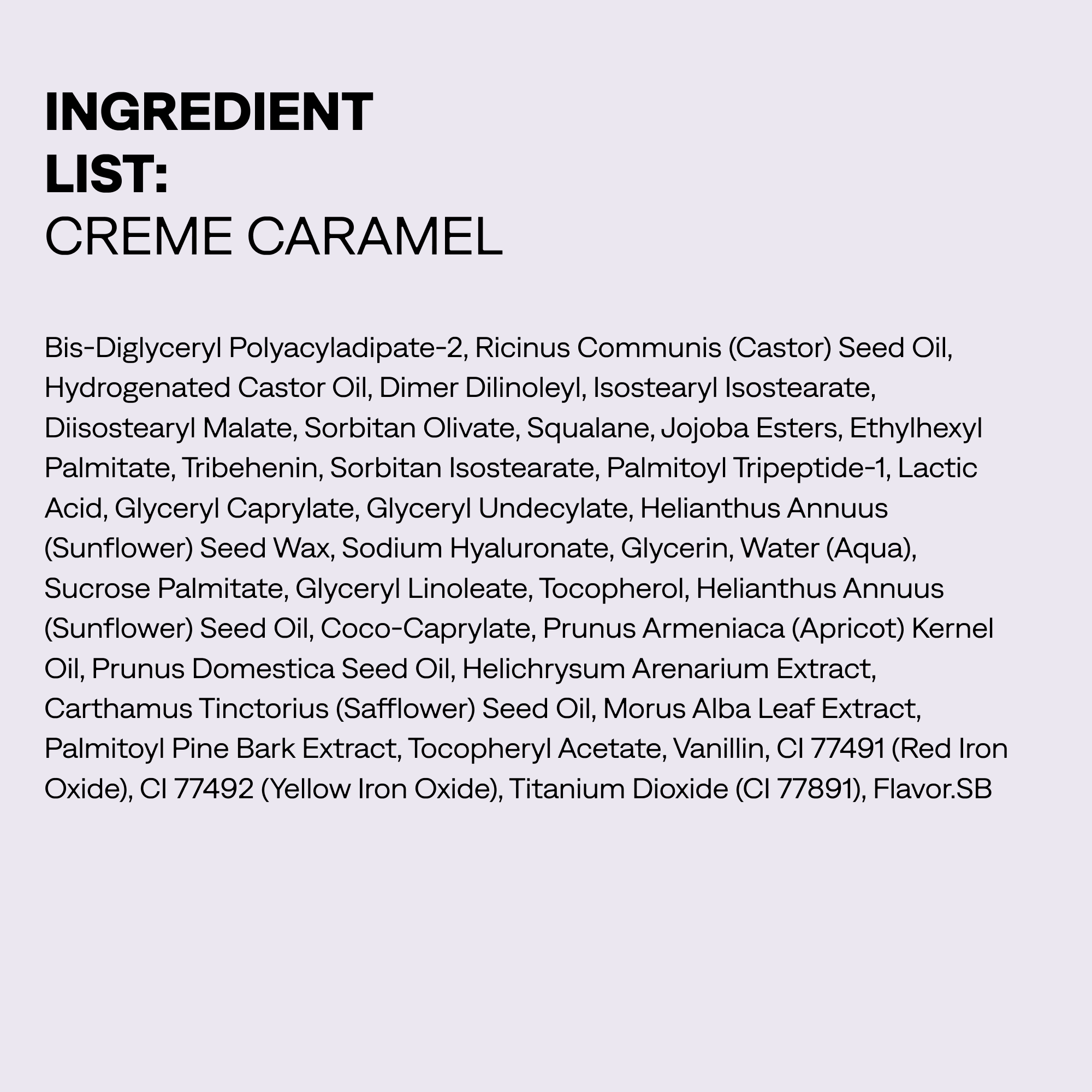 CREME CARAMEL INGREDIENTS/INGREDIÈNTS:Bis-Diglyceryl Polyacyladipate-2, Ricinus Communis (Castor) Seed Oil, Hydrogenated Castor Oil, Dimer Dilinoleyl, Isostearyl Isostearate, Diisostearyl Malate, Sorbitan Olivate, Squalane, Jojoba Esters, Ethylhexyl Palmitate, Tribehenin, Sorbitan Isostearate, Palmitoyl Tripeptide-1, Lactic Acid, Glyceryl Caprylate, Glyceryl Undecylate, Helianthus Annuus (Sunflower) Seed Wax, Sodium Hyaluronate, Glycerin, Water (Aqua), Sucrose Palmitate, Glyceryl Linoleate, Tocopherol, Helianthus Annuus (Sunflower) Seed Oil, Coco-Caprylate, Prunus Armeniaca (Apricot) Kernel Oil, Prunus Domestica Seed Oil, Helichrysum Arenarium Extract, Carthamus Tinctorius (Safflower) Seed Oil, Morus Alba Leaf Extract, Palmitoyl Pine Bark Extract, Tocopheryl Acetate, Vanillin, CI 77491 (Red Iron Oxide), CI 77492 (Yellow Iron Oxide), Titanium Dioxide (CI 77891), Flavor.SB